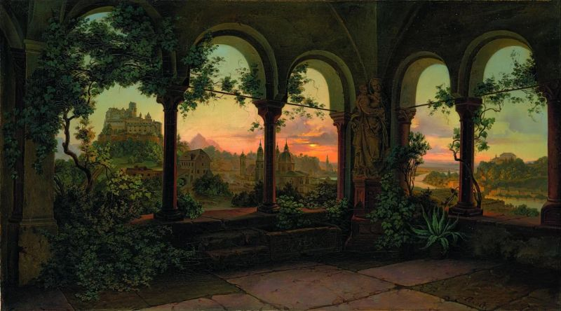 Salzbourg vu d’une loggia, peinture de Georg Pezolt, Huile sur toile, 1850